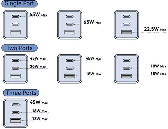 For example, a 65W power supply can output 65W when one device is connected to the USB-C port, but then splits the power 45W/20W when a second device is connected.