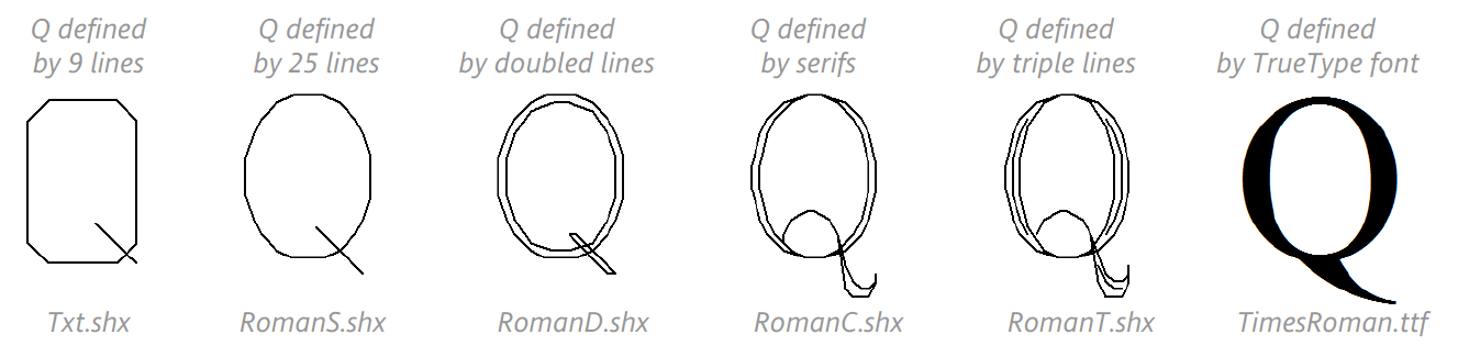 The font format developed by Autodesk for AutoCAD, for instance, is named SHX [short for “compiled shape”]. This is a vector-based font format, which uses only lines and arcs in character (or “glyph”) definitions; no fills. See the figure below.